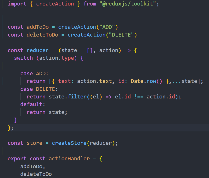 createAction 을 통해 만들어준 addToDo , deleteToDo 에 .type 을 통해 대체 하였고 ,