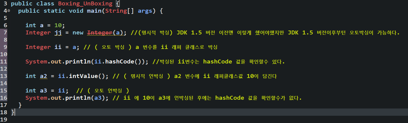 7번째 코드줄에 Integer 에 밑줄이 그어진것은 이젠 이렇게 하지않아도 된다고 프로그램이 알려주는건데