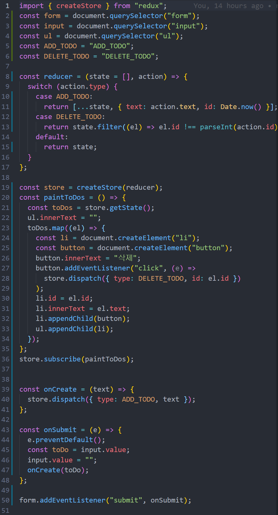 이상 redux를 이요한 delete 기능을 구현해보았습니다.