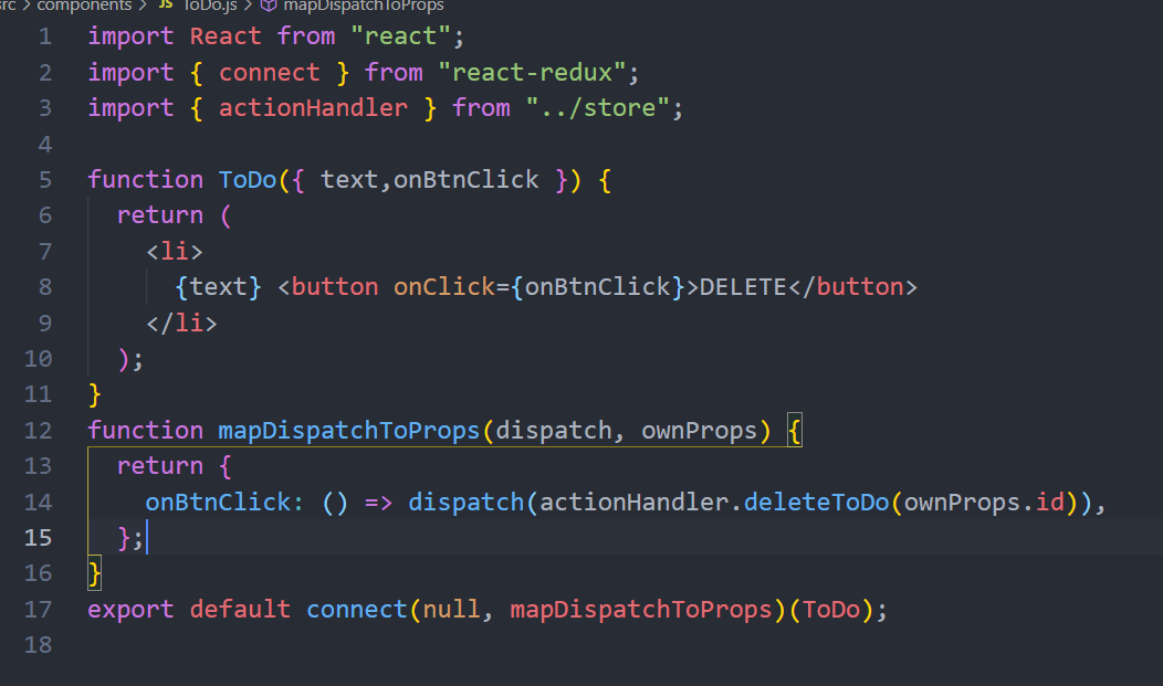 2) toDo.js 파일에 dispatch 를 사용해야하기에 connect 함수를 import 한후 위와같이 argument는 state를 불러올필요