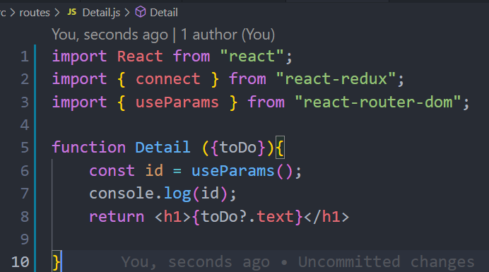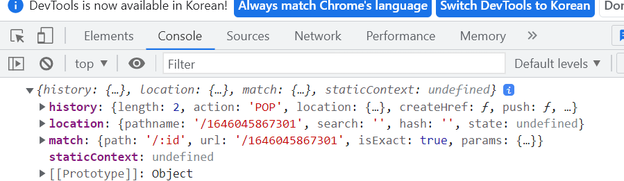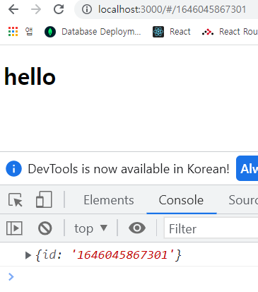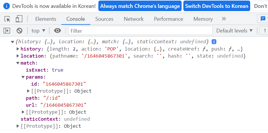 다시 console.log(ownProps.match.params.id) 를 찍어보면 id 값인 1646045867301 를 얻을수있습니다.